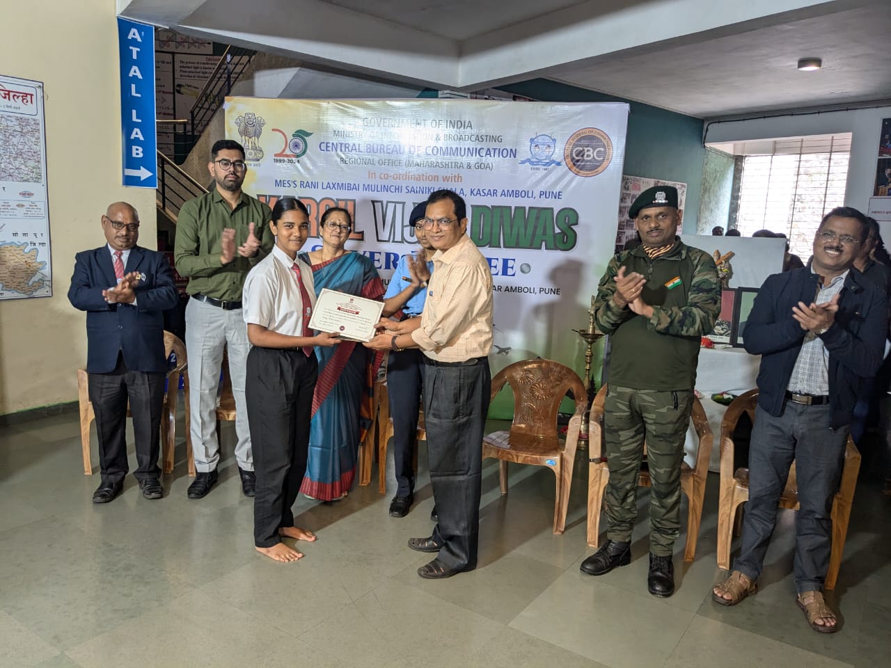 शुक्रवार, दि. २६ जुलै २०२४ रोजी भारत सरकारच्या माहिती आणि प्रसारण मंत्रालय, केंद्रीय संचार ब्युरो, पुणे व मएसो राणी लक्ष्मीबाई मुलींची सैनिकी शाळा, कासार आंबोली यांच्या संयुक्त विद्यमाने ‘कारगिल विजय दिवस’ मोठ्या उत्साहात संपन्न झाला.